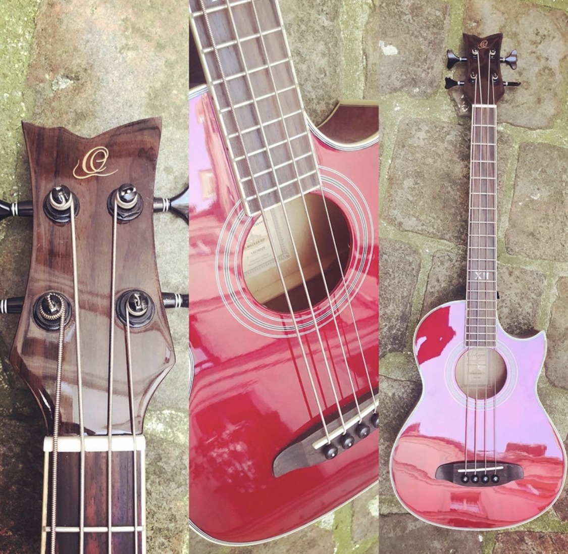 Une excellente basse acoustique de voyage. Manche custom de 625mm, pan coupé, électrifié, finition rouge gloss et vendu avec house et strap. Que demande le peuple !