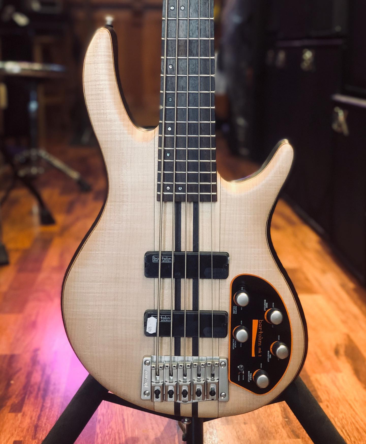 23 OctLa totale façon Cort. Manche conducteur 5 cordes, micros et préamp Bartolini, mécas et chevalet Hipshot.