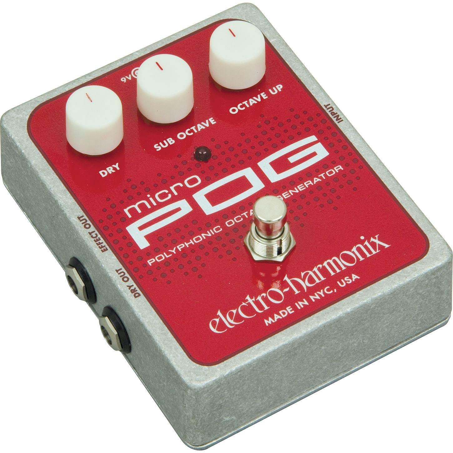 Vous pouvez régler une octave supérieure avec le potentiomètre Octave du Micro POG, tandis qu’un potentiomètre Sub Octave ajoute une octave inférieure. Un potentiomètre Dry mélange la quantité d’effet. Le pédalier étend votre territoire sonore avec une étendue de trois octaves à partir de votre note originale, vous permettant d’émuler une guitare douze cordes, une basse huit cordes, voire un orgue.